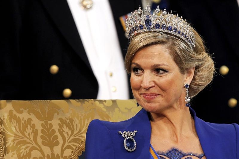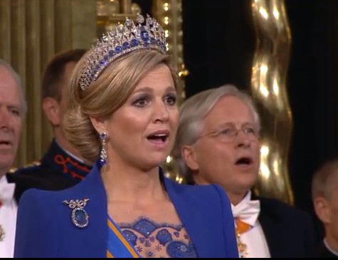 Máxima de Holanda cantando el himno real y cumpliendo entregada con el protocolo, que en caso de la Casa Real holandesa resulta en esta ocasión más relajado que otras homólogas europeas. El traje azul añil elegido por la Reina ha sido todo un éxito.