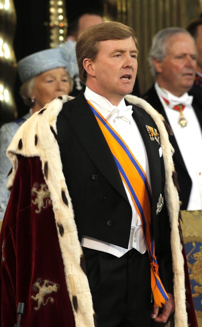 El Rey Guillermo pronuncia su primer discurso como monarca holandés. La capa de armiño es el elemento más destacado y tradicional de la, por otra parte, sobria imagen del nuevo Rey, que ni siquiera se ha colocado la corona.