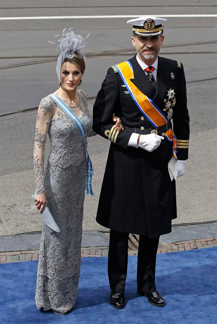 Los Príncipes de Asturias representaron a España en la ceremonia de investidura en Amsterdam. Pese a arrasar con su modelo en la cena de gala de la noche anterior, Letizia no consiguió convencer a todo el mundo con su vestido de seda y su llamativo tocado de plumas.