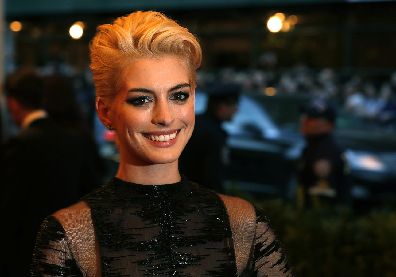 Anne Hathaway lució su look más punk para la inauguración de la exposición de primavera del Metropolitan. La reina de la alfombra roja en los últimos Óscar, tras el episodio de los pezones resaltados por Miuccia Prada, optó por un Valentino vintage de 1992, negro de transparencias jaspeadas.