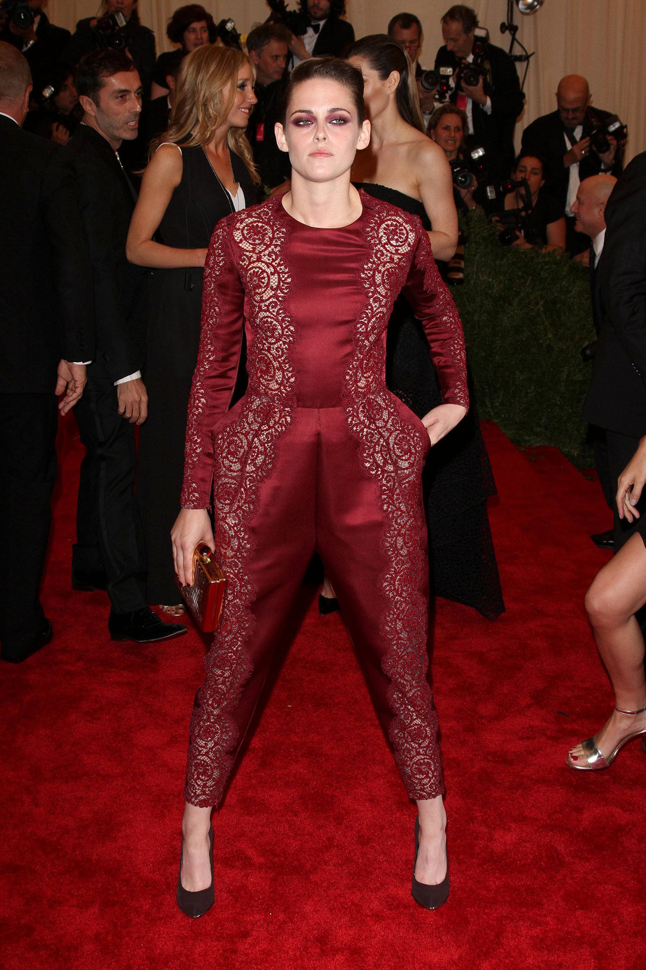 La diseñadora Stella McCartney escogía a la lánguida Kristen Stewart, de la saga Crepúsculo, con un mono granate brocado y tupé que acentuaban su androginia.