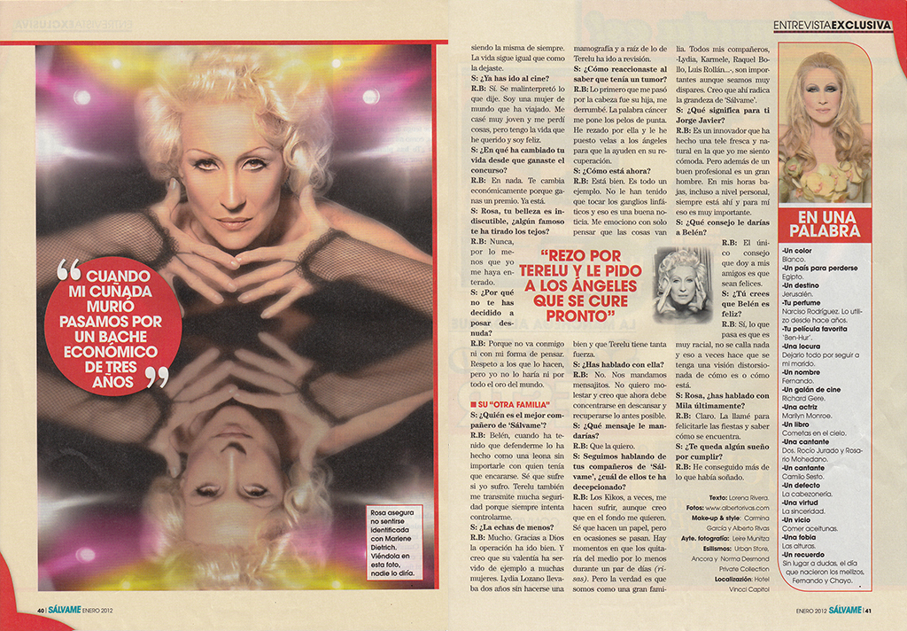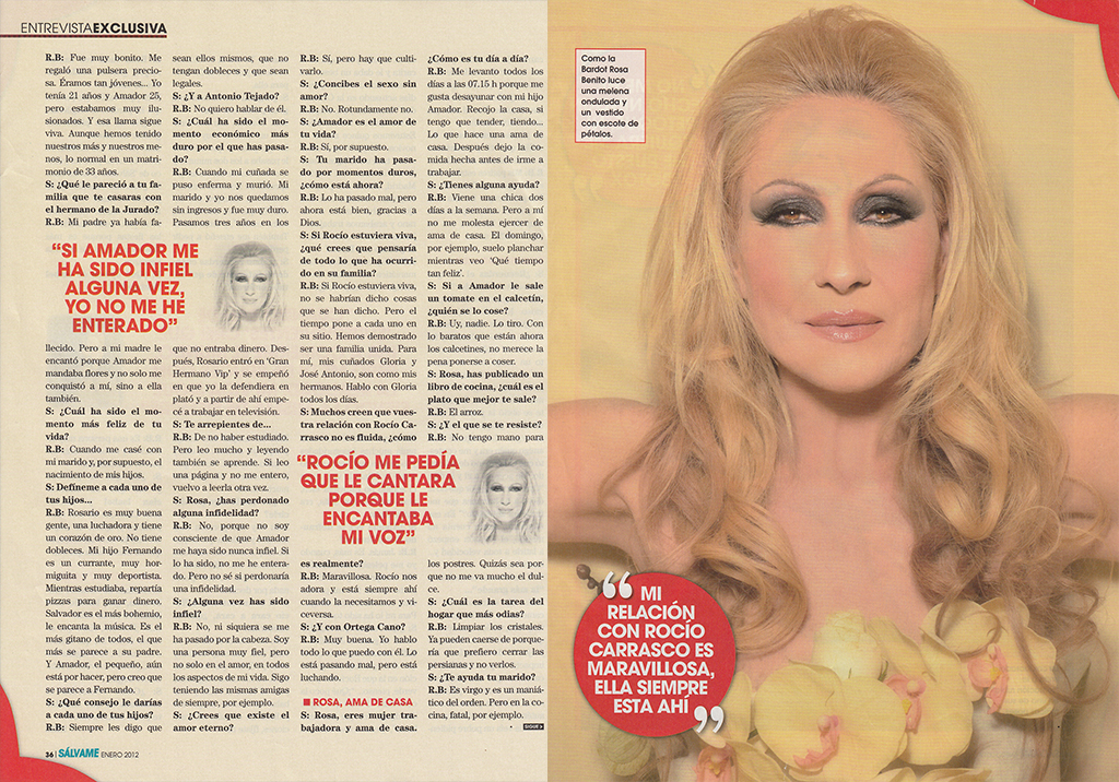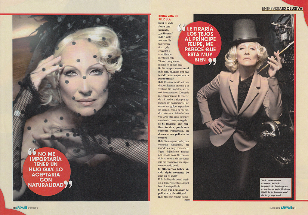Así resume la entrevistadora la carrera mediática de Rosa Benito, caracterizada en esta doble página como Marilyn Monroe.
