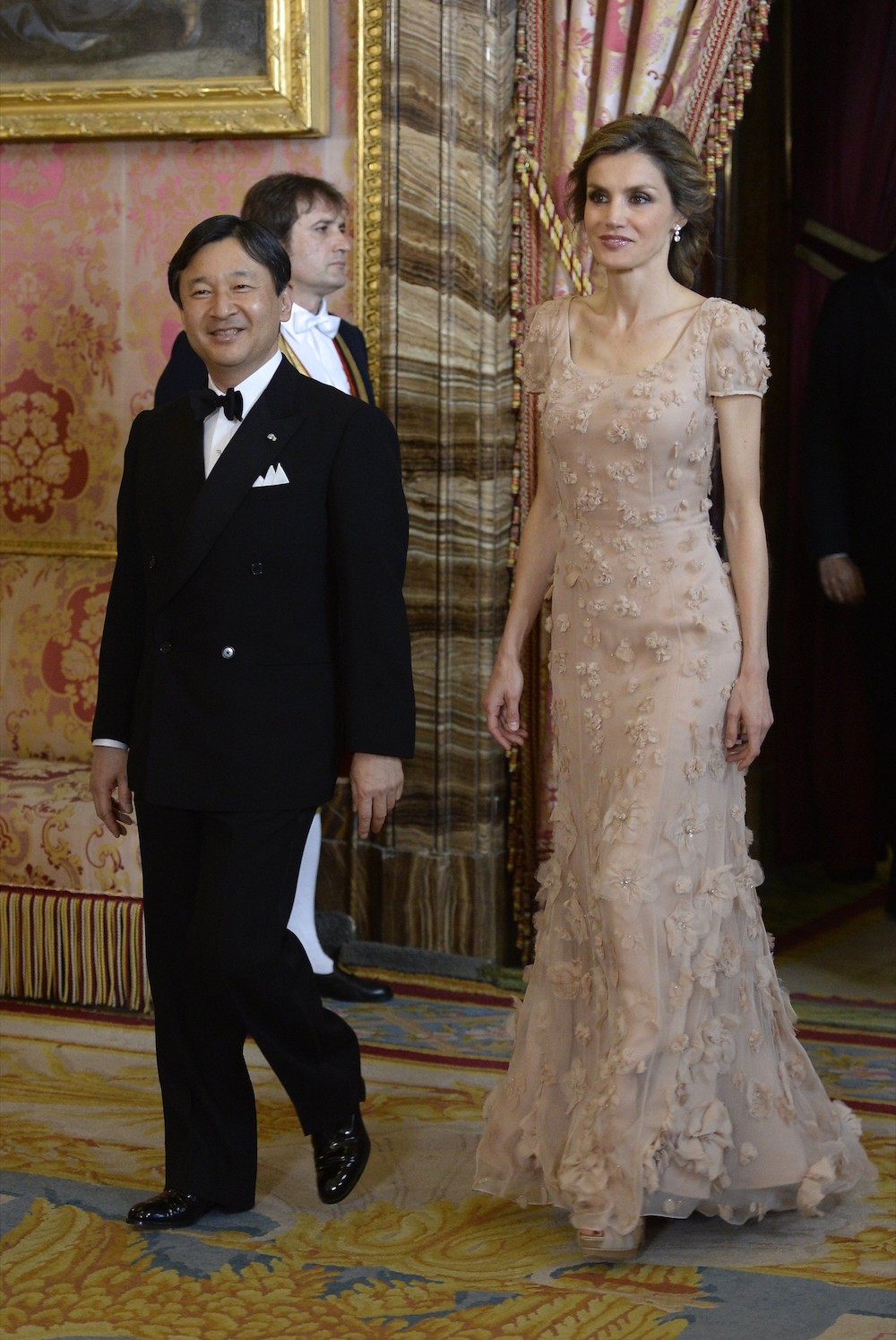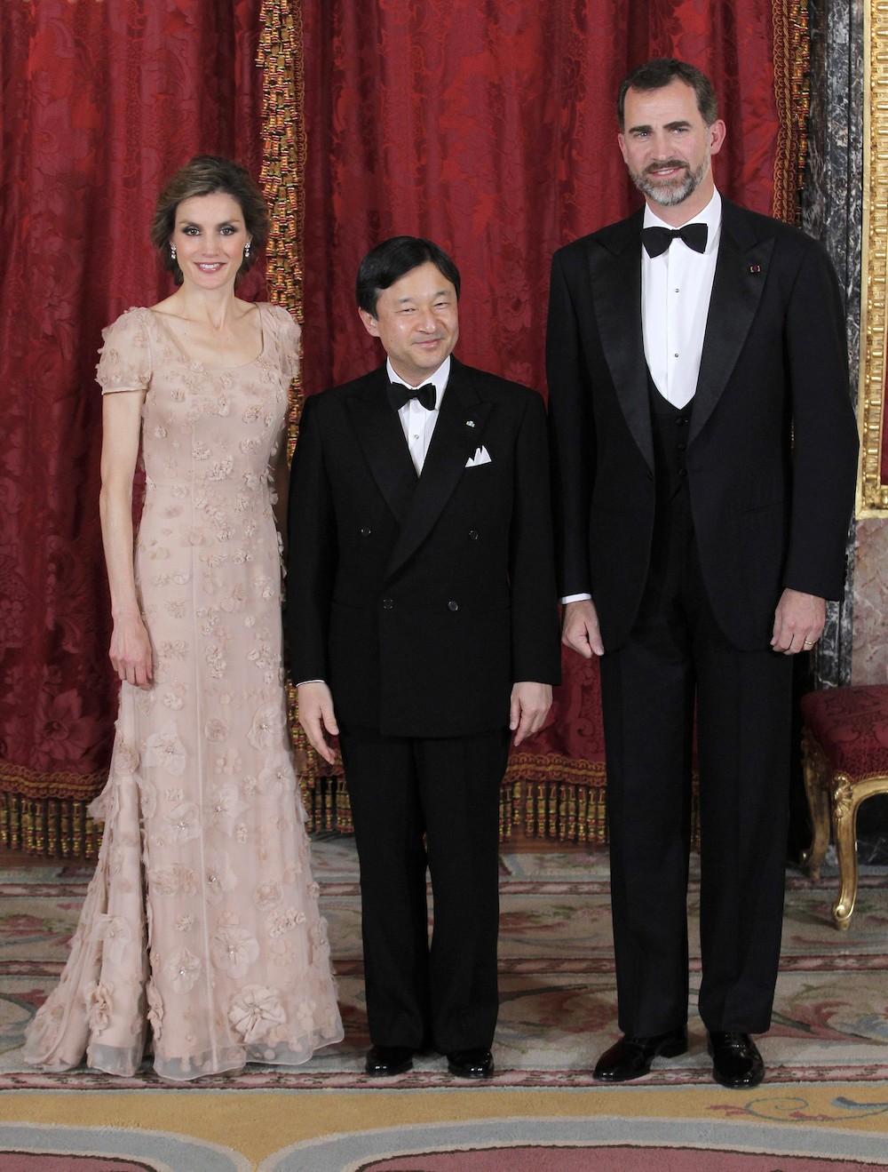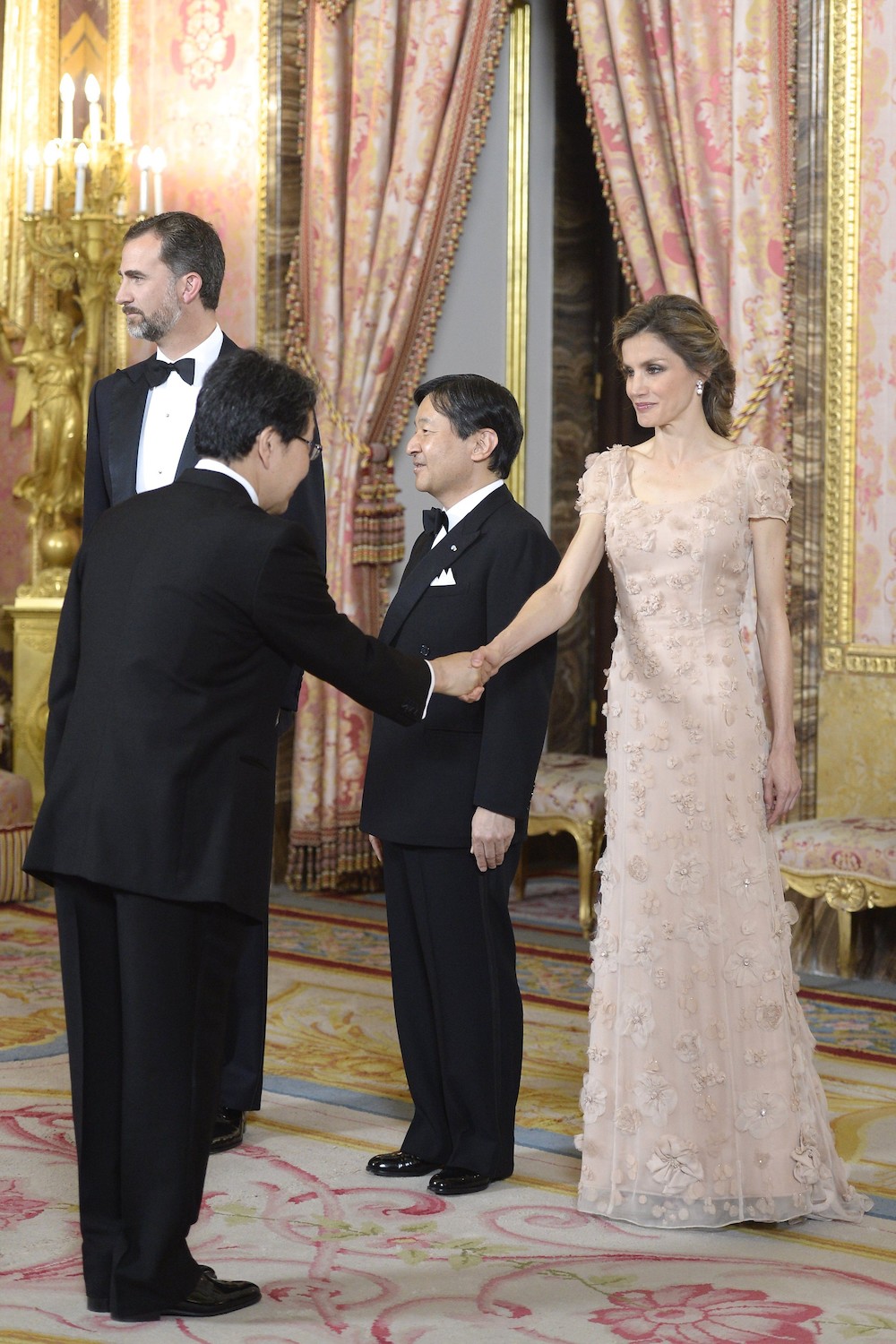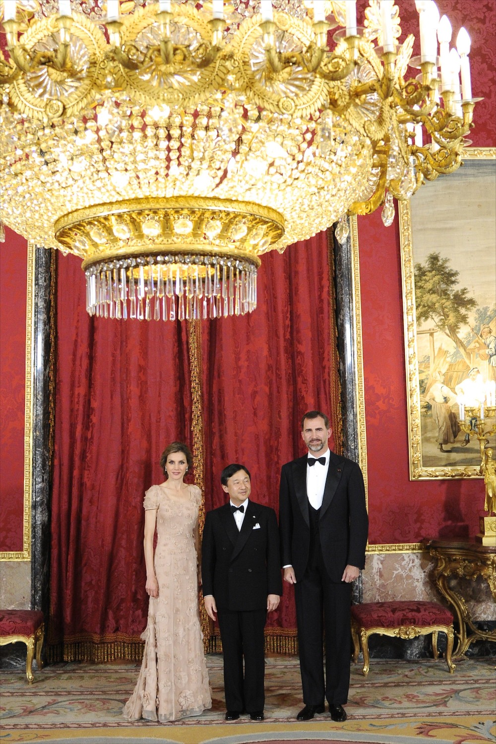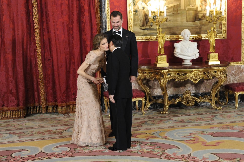 La cena oficial se celebró con motivo de la visita de Naruhito a España. Todo empezó con el recibimiento de los principes al próximo heredero de Japón, en el Salón Teniers. Cientos de fotógrafos y reporteros esperaban para mortalizar este momento.