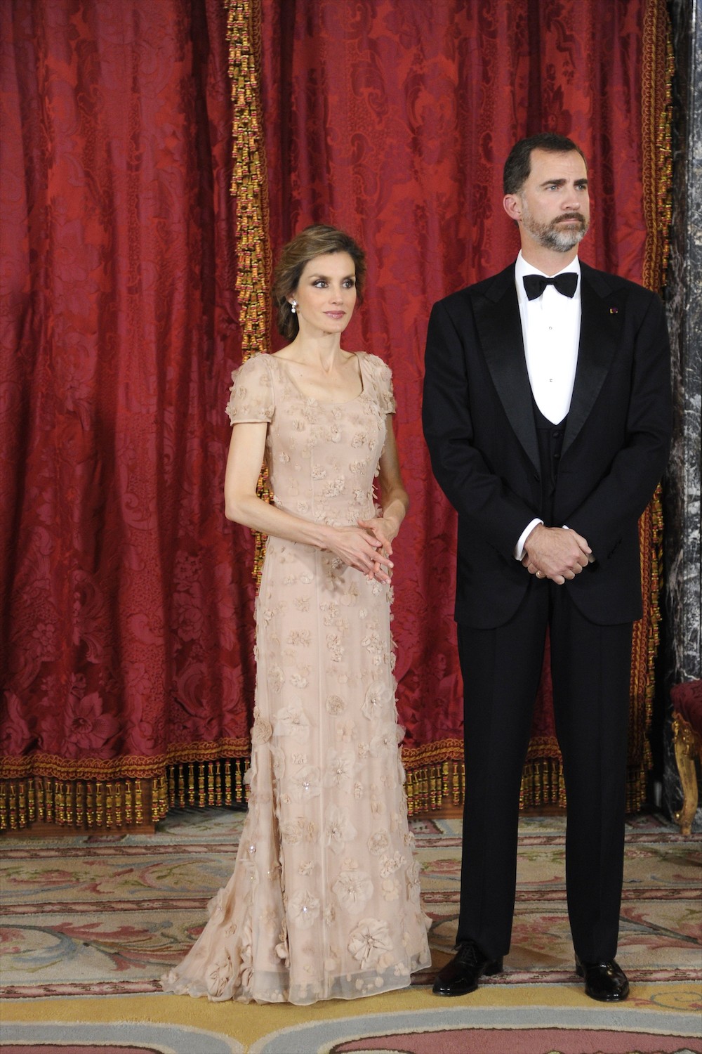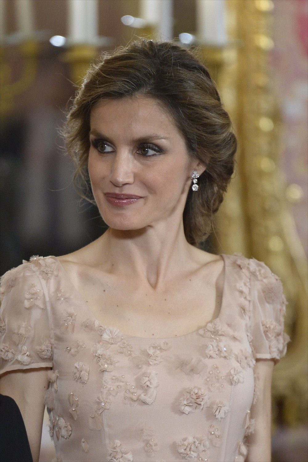 La princesa Letizia estaba radiante. Lució un vestido de color crudo, con flores bordadas y pedrería. La Príncesa de Asturias llevaba un recogido acabado en trenza, que le favorecía. Estaba deslumbrante.