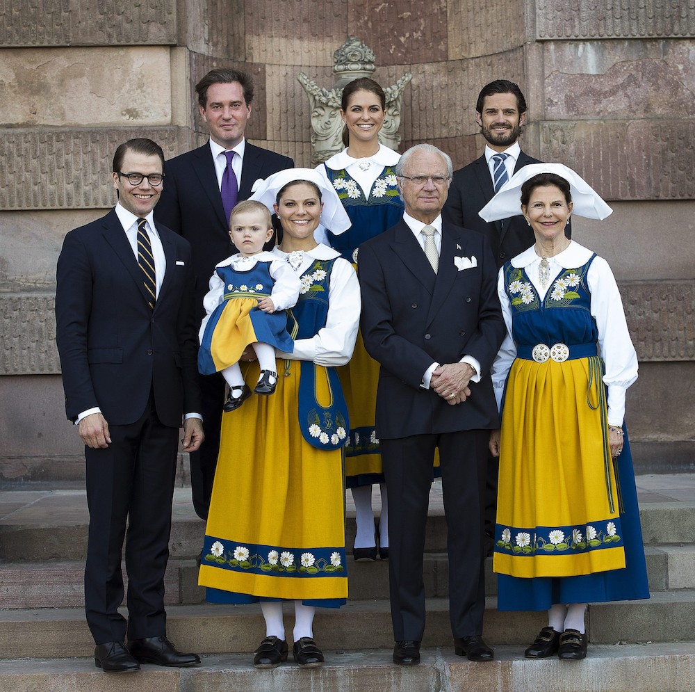 Pocos días antes de la boda de Magdalena, la Familia Real sueca posó de esta guisa ante los medios. Los varones se libraron de lucir el vestido regional sueco pero ellas sí se lo pusieron. Sólo la reina y la princesa Victoria llevan tocado. El motivo, que están casadas