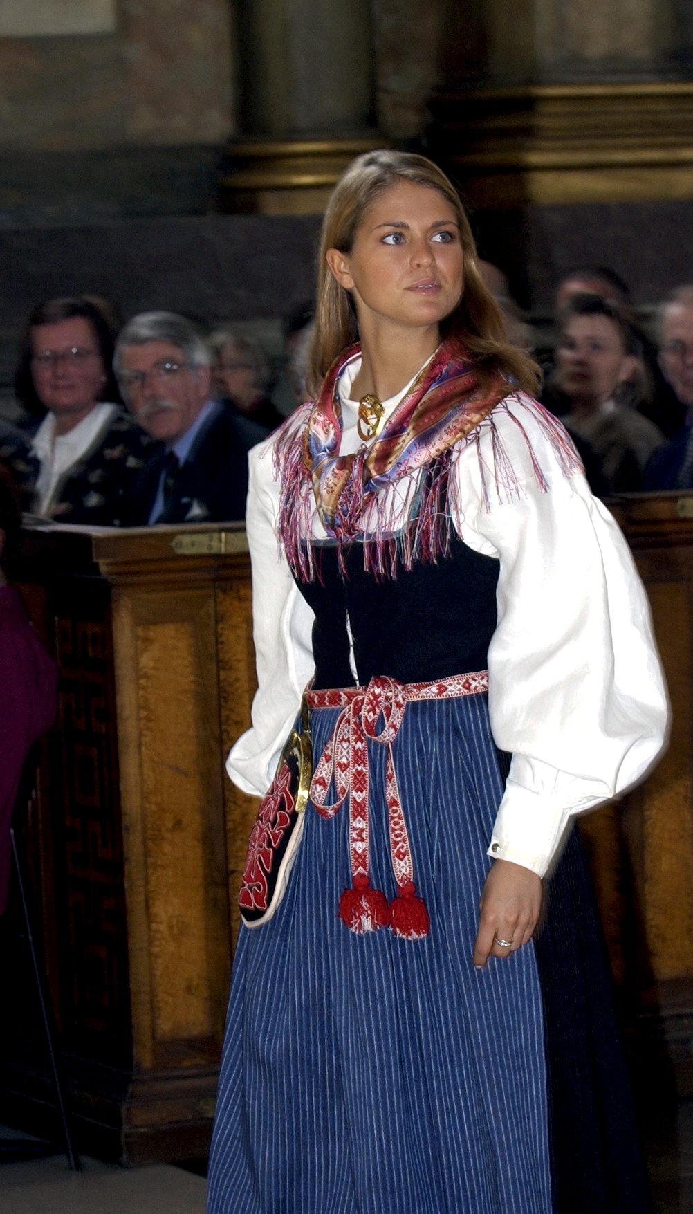También es habitual ver a Magdalena de Suecia vistiendo traje regional. En 2003, una jovencísima y bella princesa lució este atuendo en una ceremonia religiosa en Estocolmo