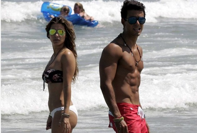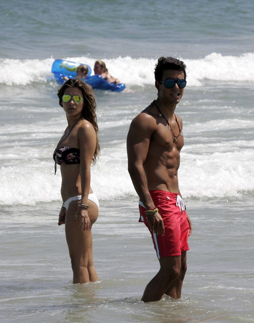 Tanto él como ella demostraron que tienen sus cuerpos moldeados a base de gimnasio y dieta. Tablada lució su estupenda figura con un bikini mezclado de braga blanca y la parte de arriba con dibujos en marrón y un cuerno azul. La diseñadora se mostró aún menos atrevida y no pasó de las rodillas en su baño.