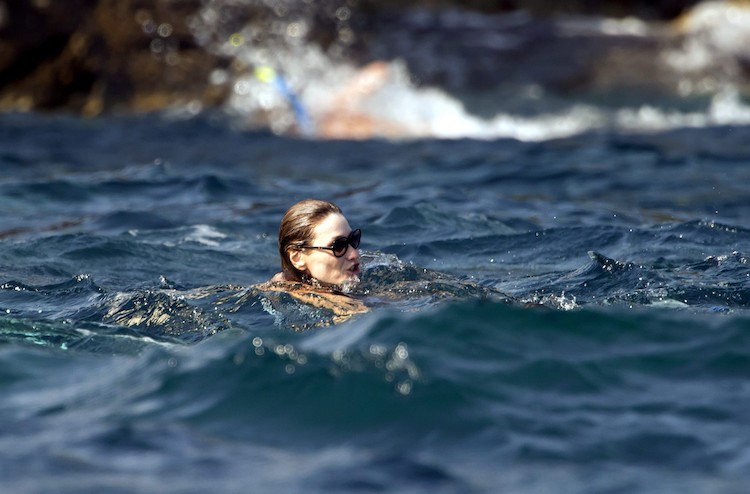 Bruni se metió en el agua con aletas y las gafas de sol puestas. Decidida a hacer ejercicio, la cantante está mucho más relajada que cuando ejercía de primera dama francesa.