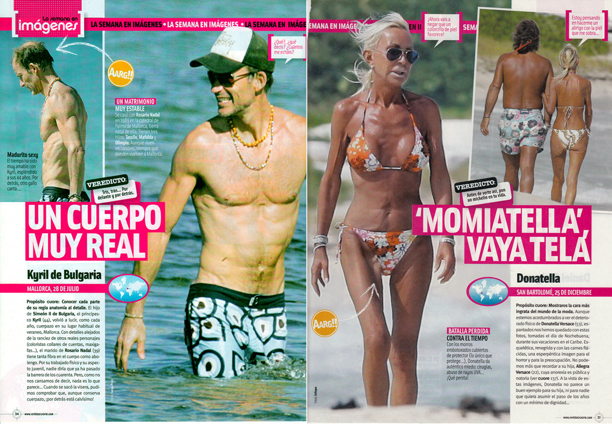 En los comedidos reportajes de las revistas del corazón de antaño no había sitio para la ironía o la declaración de intenciones. Las cosas han cambiado, vemos uno par de ejemplos antagónicos del pasado reciente, gracias a Cuore. Alabanzas al cuerpo del verano por excelencia (hasta ¡Hola! lo ha llamado papá cañón en su última edición), Kyril de Bulgaria. Y malvados comentarios para el bikinazo de Donatella Versace.