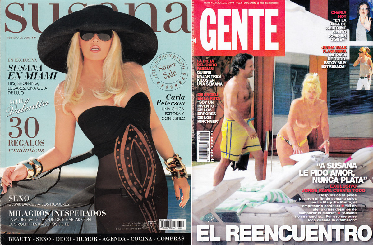 Susana Giménez triunfó en los años setenta en el cine argentino. Actualmente es la presentadora estrella de la televisión de su país, además de productora y directora de su propia revista semanal. Como nuestra Ana Rosa. En el 2009 posaba para la portada con atuendo veraniego, mientras que un mes más tarde aparecían en la prensa del corazón las imágenes de su topless estival.