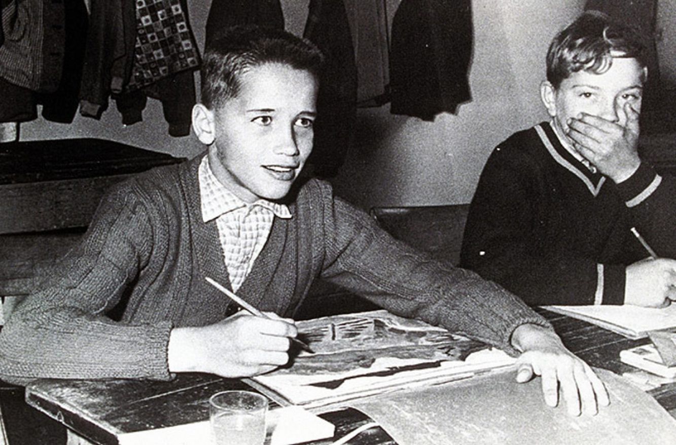 Fíjense qué aplicado se ve a este joven bávaro mientras dibuja en su pupitre. Los complejos por su físico delgado y desgarbado le llevaron a convertirse en campeón de culturismo. De ahí al cine y al gobierno del estado de California. Arnold Schwarzenneger.