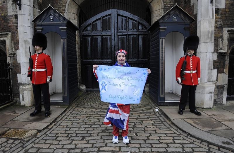 Un hombre posa con una pancarta a las puertas del palacio de St.James, donde ha sido bautizado el príncipe Jorge, hijo de los duques deCambridge, en Londres.