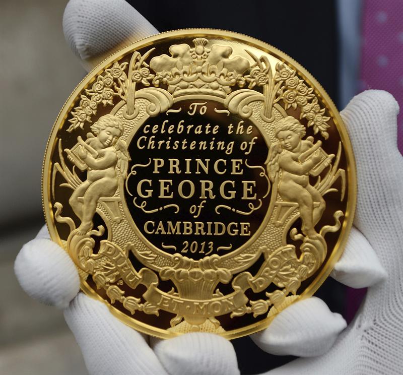 El jefe del departamento de grabados del Royal Mint, la fábrica de monedas británica, Gordon Summer, muestra una moneda de oro conmemorativa fabricada con motivo de la celebración del bautizo del príncipe Jorge, hijo de los duques de Cambridge en Londres.