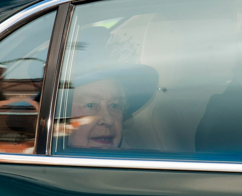La reina Isabel II, llegando a la capilla donde van a bautizar a su nieto, el príncipe Jorge de Cambridge. Posiblemente, vaya vestida en tonos azules, ya que su sombrero es de ese color.