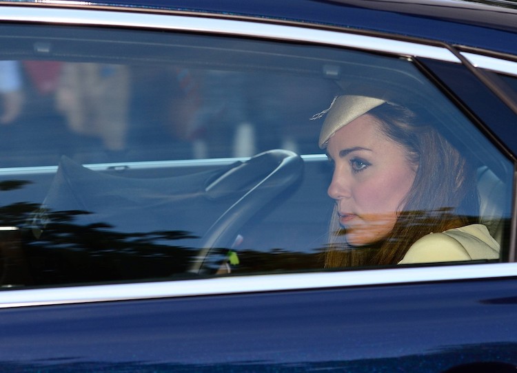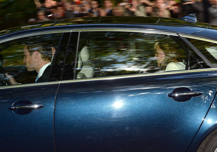 Catalina de Cambridge, en el asiento trasero del coche a su llegada al bautizo de su hijo. El príncipe Jorge, que este martes cumplió tres meses, es tercero en la línea de sucesión a la corona británica después de su padre, el príncipe Guillermo.