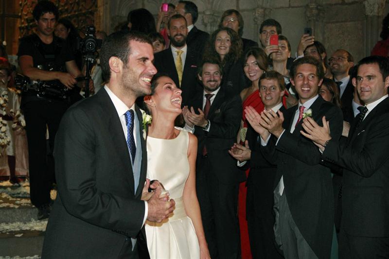 Los recién casados Pablo Lara, hijo del presidente del grupo Planeta José Manuel Lara Bosch, y Anna Brufau, hija de uno de los altos directivos de Indra en Cataluña, Manuel Brufau, a la salida de la iglesia de Santa María del Mar.