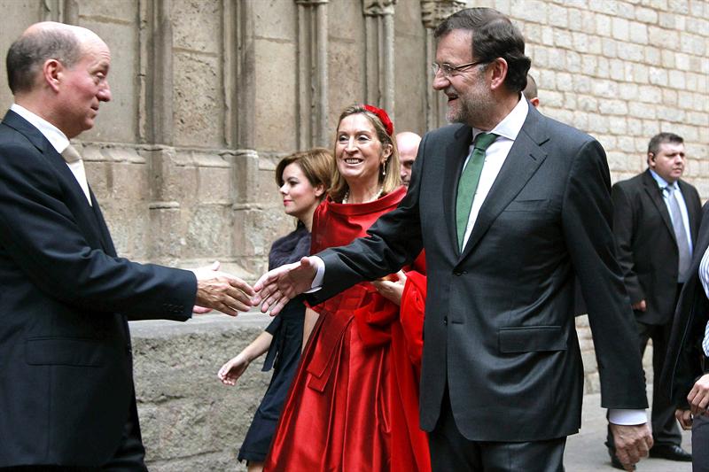 El presidente del Gobierno Mariano Rajoy (d) saluda al responsable de comunicación del Grupo Planeta, en presencia de la ministra de Fomento, Ana Pastor (c) y la vicepresidenta del Gobierno, Soraya Sáenz de Santamaría minutos antes de entrar a la iglesia de Santa María del Mar donde se ha celebrado la boda entre Pablo Lara García y Anna Brufau.