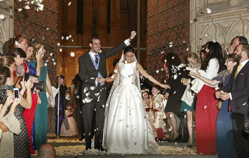 Los recién casados Pablo Lara y Anna Brufau a la salida de la iglesia de Santa María del Mar donde se ha celebrado el enlace a la que han asistido numerosas personalidades.