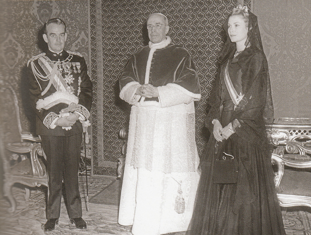 El 30 de abril de 1957, apenas tres meses después del nacimiento de Carolina, los príncipes fueron recibidos por el Papa Pío XII. Gracia Patricia espectacular de negro y con mantilla, según manda el protocolo.