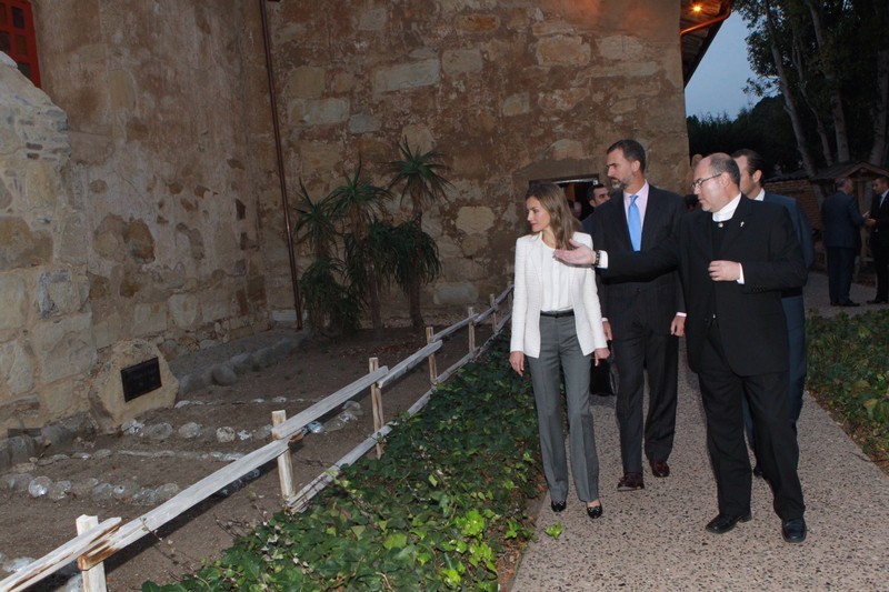 Los Príncipes de Asturias visitaron el recinto del cementerio de la Misión de San Carlos Borromeo del río Carmel. Los herederos recorrieron la Misión de San Carlos Borromeo del río Carmel sin perderse ningún rincón del edificio. El principe lució un traje negro con una camisa de rosa claro y una corbata azul.