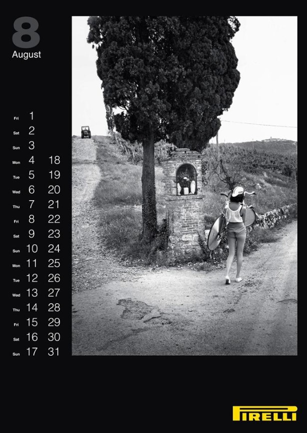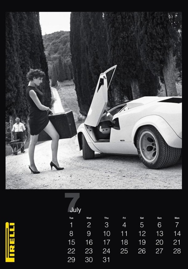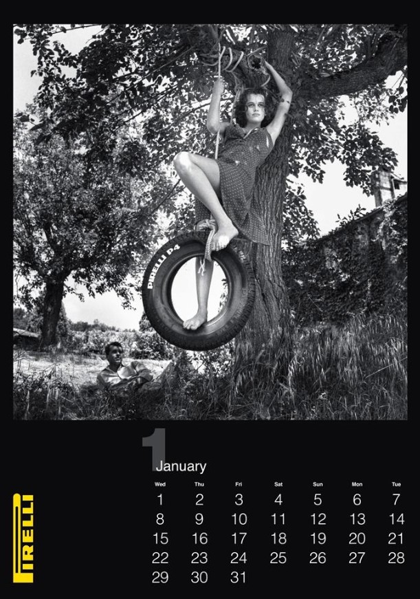 Imagen correspondiente al mes de enero, tomada por el difunto fotógrafo germano-australiano Helmut Newton en 1986. Todas ellas fueron tomadas en la campiña italiana y en ellas, de alguna manera, los neumáticos Pirelli tienen su cuota de protagonismo.
