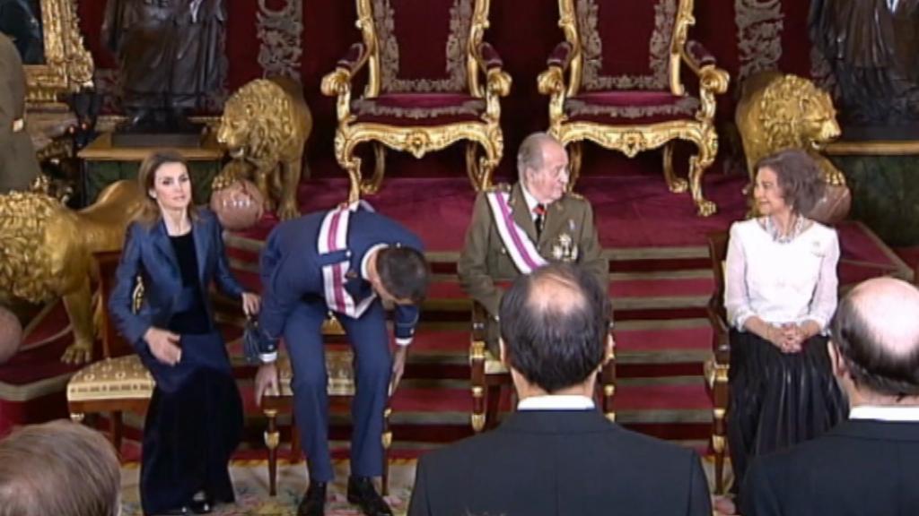 La princesa Letizia estuvo a punto de caerse al sentarse durante la Pascua Militar. Tras el pequeño susto inicial, doña Letizia se sentó correctamente en su sitio.