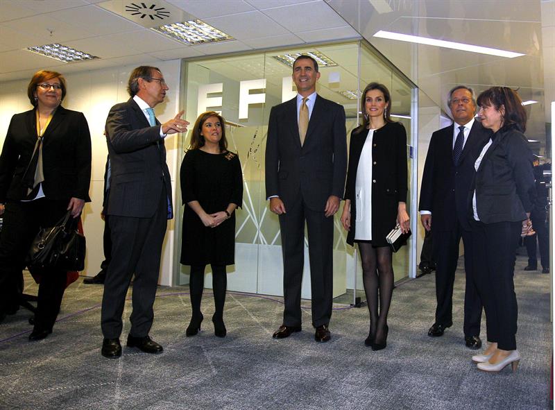 La vicepresidenta del Gobierno, Soraya Sáenz de Santamaría, la secretaria de Estado de Comunicación, Carmen Martínez de Castro, el presidente de la SEPI, Ramón Aguirre, y el presidente de Efe, José Antonio Vera, han recibido a don Felipe y doña Letizia a la entrada de la agencia, situada en la madrileña Avenida de Burgos.
