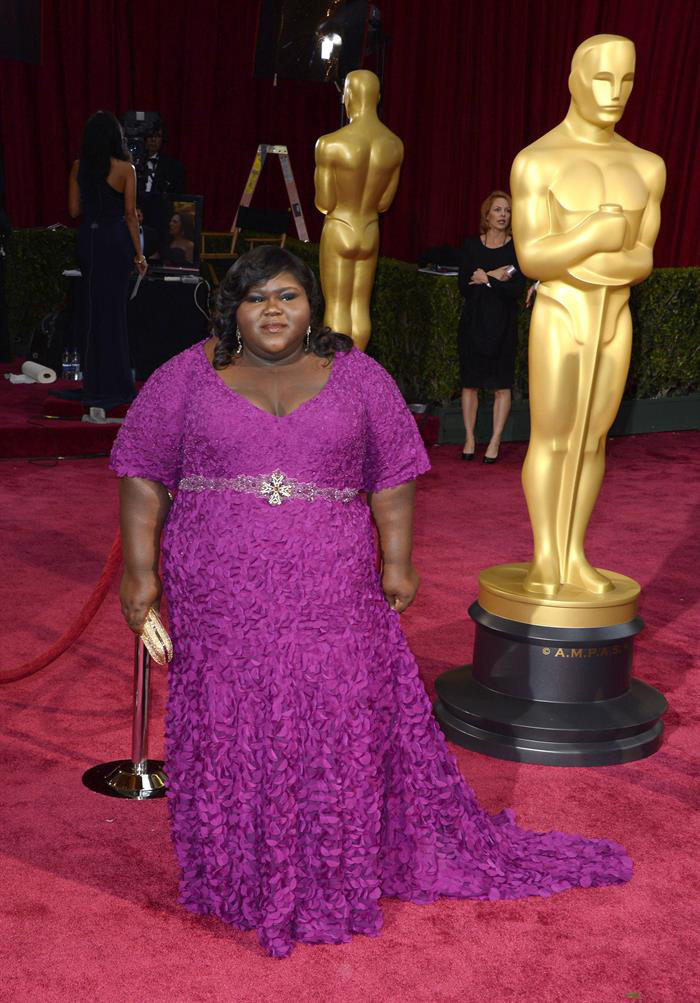La actriz Gabourey Sidibe prefirió un vestido en púrpura con pétalos en la falda, un escote en forma de V y un detalle en la cintura. Ha sidpo muy criticada por su elección, ya que no le favorecía nada.