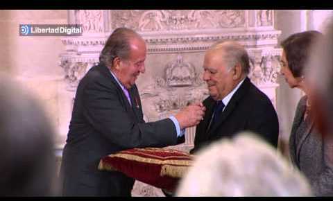 El Rey se ha "peleado" durante dos minutos con la solapa del traje del premiado con el Toisón de Oro, el exsecretario general iberoamericano, Enrique Iglesias.