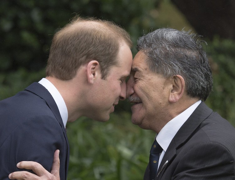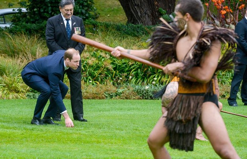 El príncipe Guillermo se agacha para recoger un dardo como parte del desafío a la bienvenida oficial en los terrenos de la Casa de Gobierno, en Wellington.