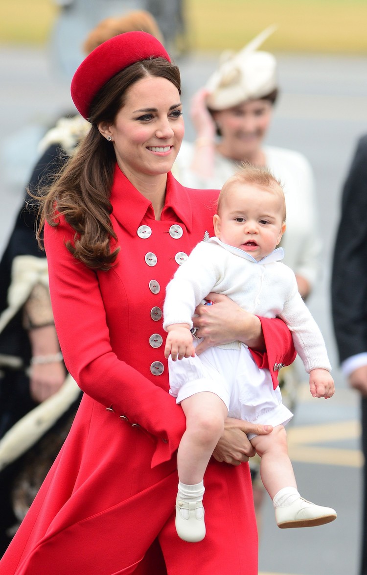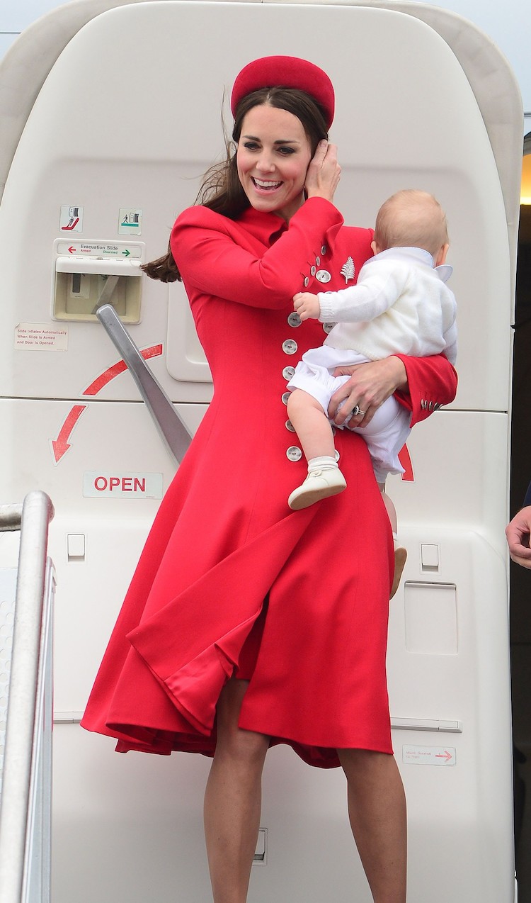 Antes de abordar una limusina que los llevó a la Casa de Gobierno en Wellington, Guillermo, Catalina y su bebé estuvieron apenas dos minutos en la pista de aterrizaje, arropados por la algarabía de sus simpatizantes y un tiempo marcado por el viento y la lluvia. La duquesa vestía un abrigo escarlata, un sombrero del mismo color y un broche con la forma de una pluma plateada, que le fue regalado a la reina Isabel II en su gira a Nueva Zelanda en la década de 1950.