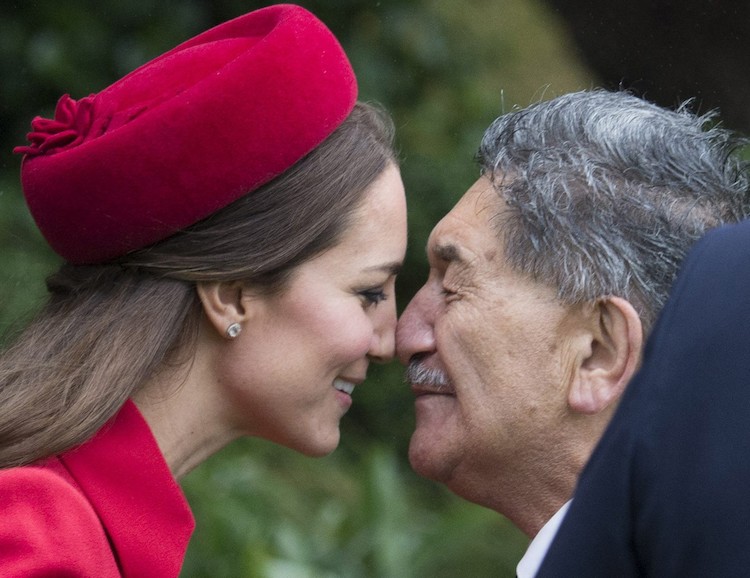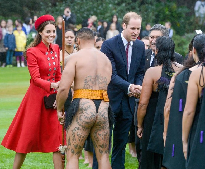 El pequeño Jorge observó desde una ventana mientras sus padres, el duque y la duquesa de Cambridge, fueron recibidos en Nueva Zelanda con una danza de guerra maorí tradicional en la Casa de Gobierno en Wellington. La niñera española María Teresa Turrion Borrallo tomó fotos de la escena mientras los maoríes bailaban el haka tradicional.