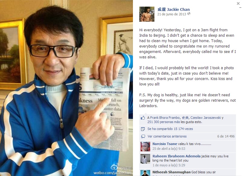 Jackie Chan es otro famoso "muerto" en Twitter. Según las redes sociales, la causa del fallecimiento fueron una serie de complicaciones cardíacas. El hashtag #RIPJackieChan se convirtió en uno de los temas más comentados en cuestión de minutos. Todo fue desmentido rápidamente en Facebook: "Jackie está vivo y bien. No sufrió un ataque al corazón y no murió, se encuentra preparándose para la filmación de su siguiente película".