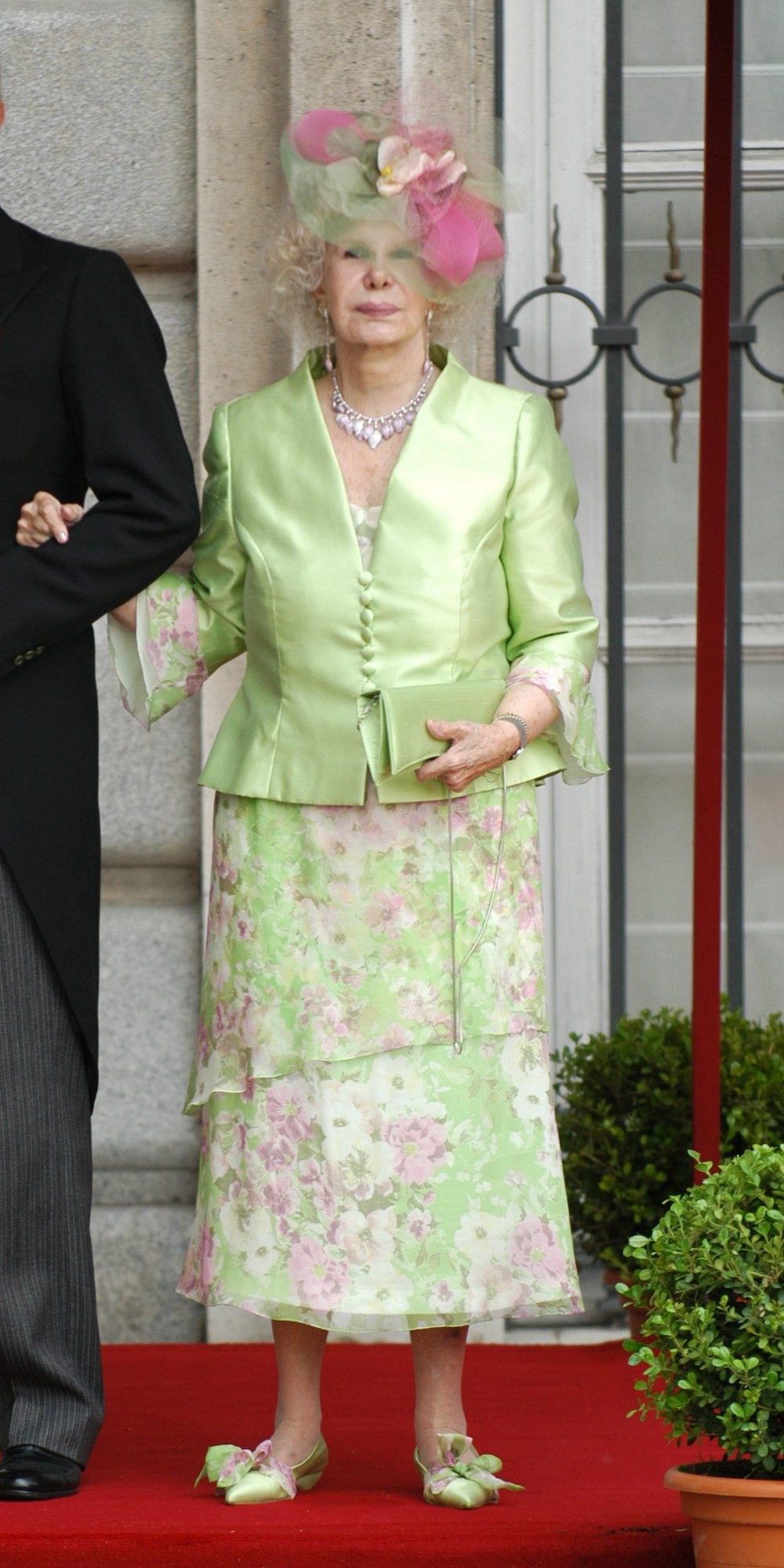Cayetana Fitz-James Stuart llevaba flores hasta en los zapatos. No acertó con este vestido y el tocado. Pero incluso así, la duquesa es única.