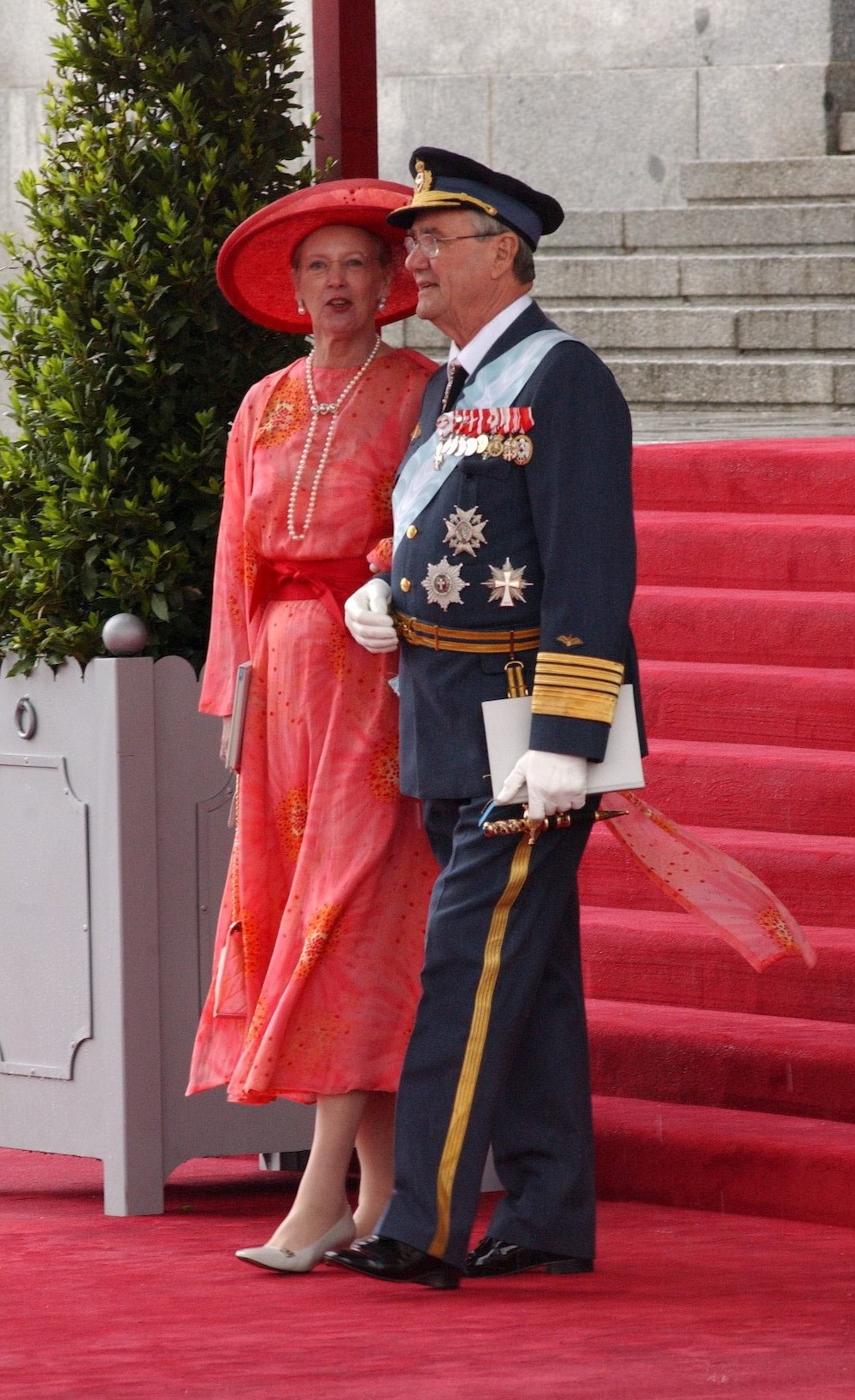 Margarita de Dinamarca tampoco estaba nada favorecida con este vestido rojo con margaritas naranjas.