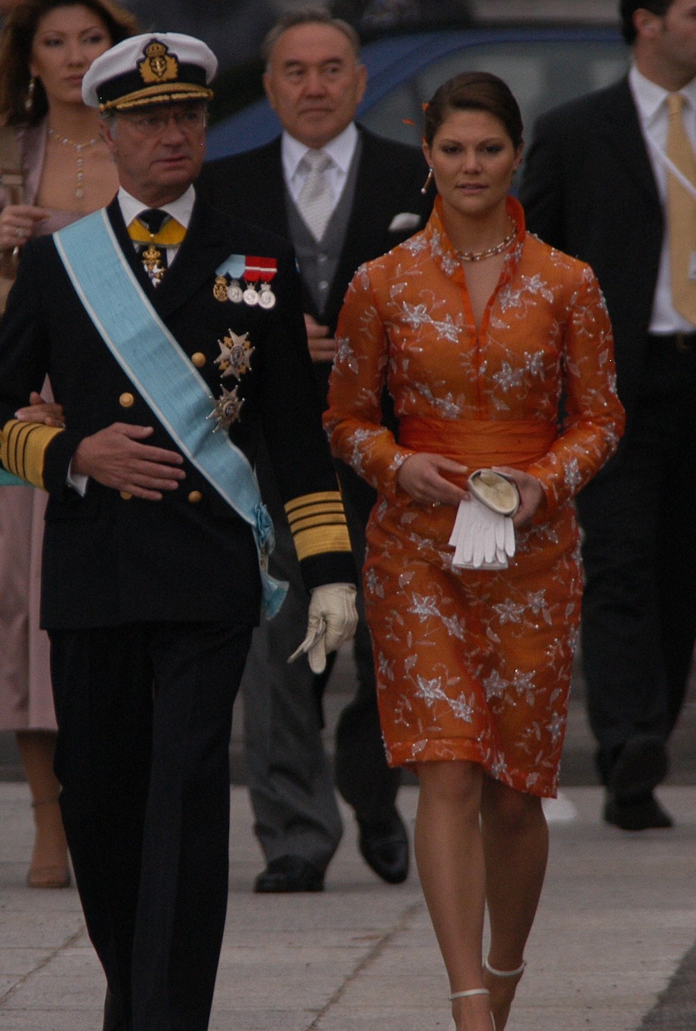 Victoria de Suecia tampoco acertó con este vestido naranja con brillos.