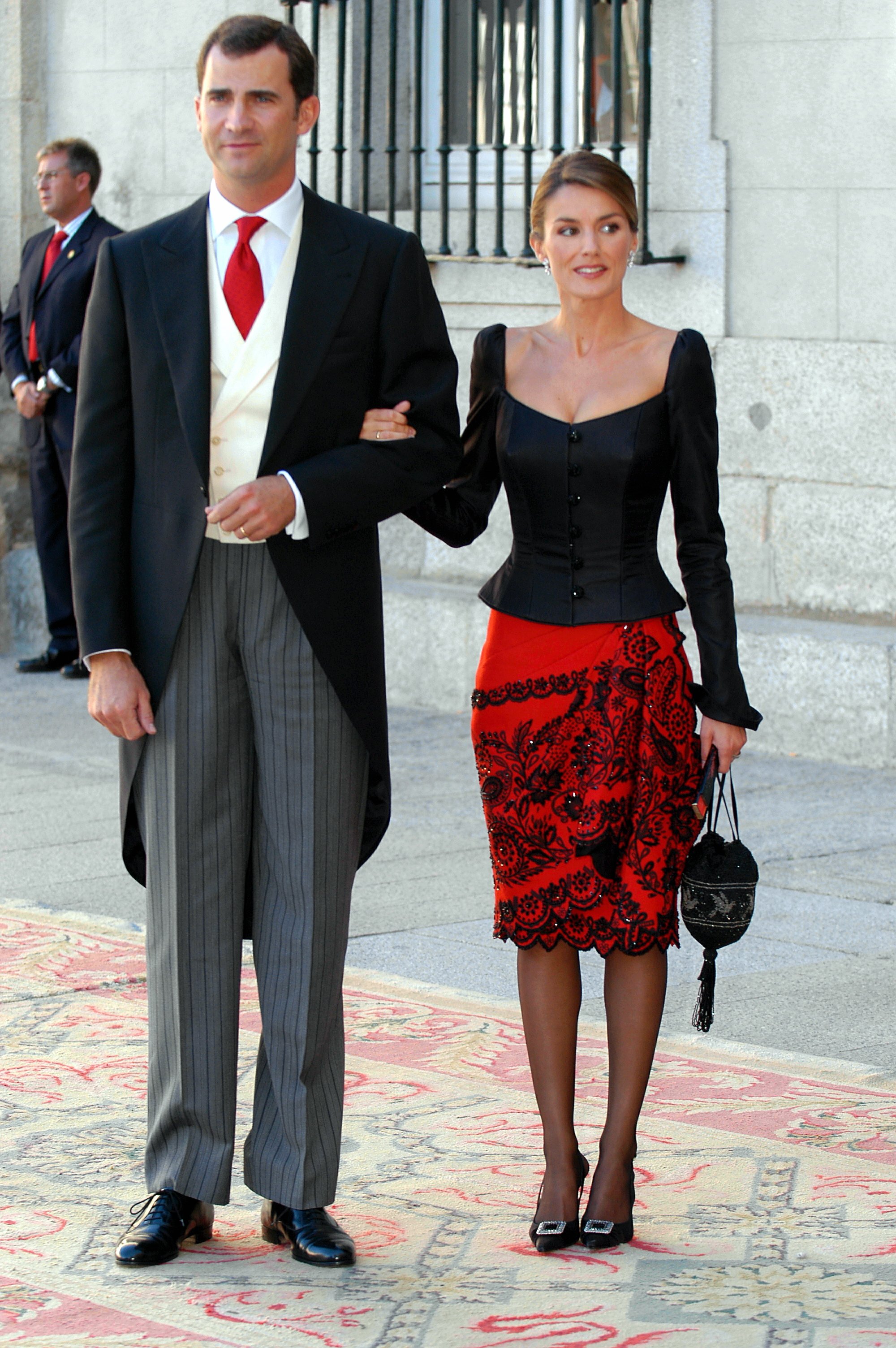 Espectacular Letizia en la boda de Beltrán Gómez Acebo (primo del príncipe) con Laura Ponte. La princesa de Asturias lució un cuerpo negro abotonado con un pronunciado escote y una falda roja con bordados negros, de Lorenzo Caprile