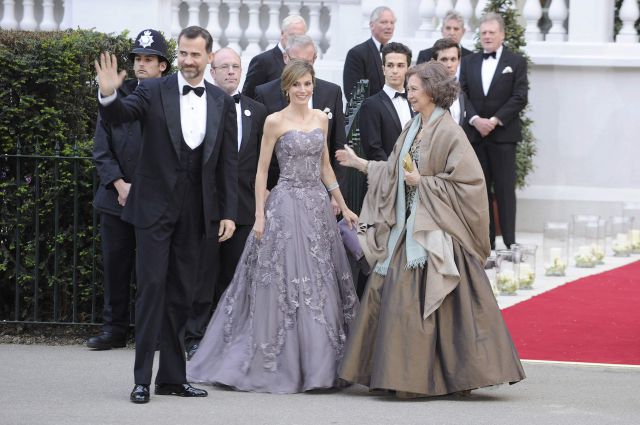 Letizia volvió a confiar en Felipe Varela para la cena de gala previa al enlace entre Guillermo de Inglaterra y Kate Middleton. Un bonito diseño escote palabra de honor, con bordados de flores en tono gris lavanda