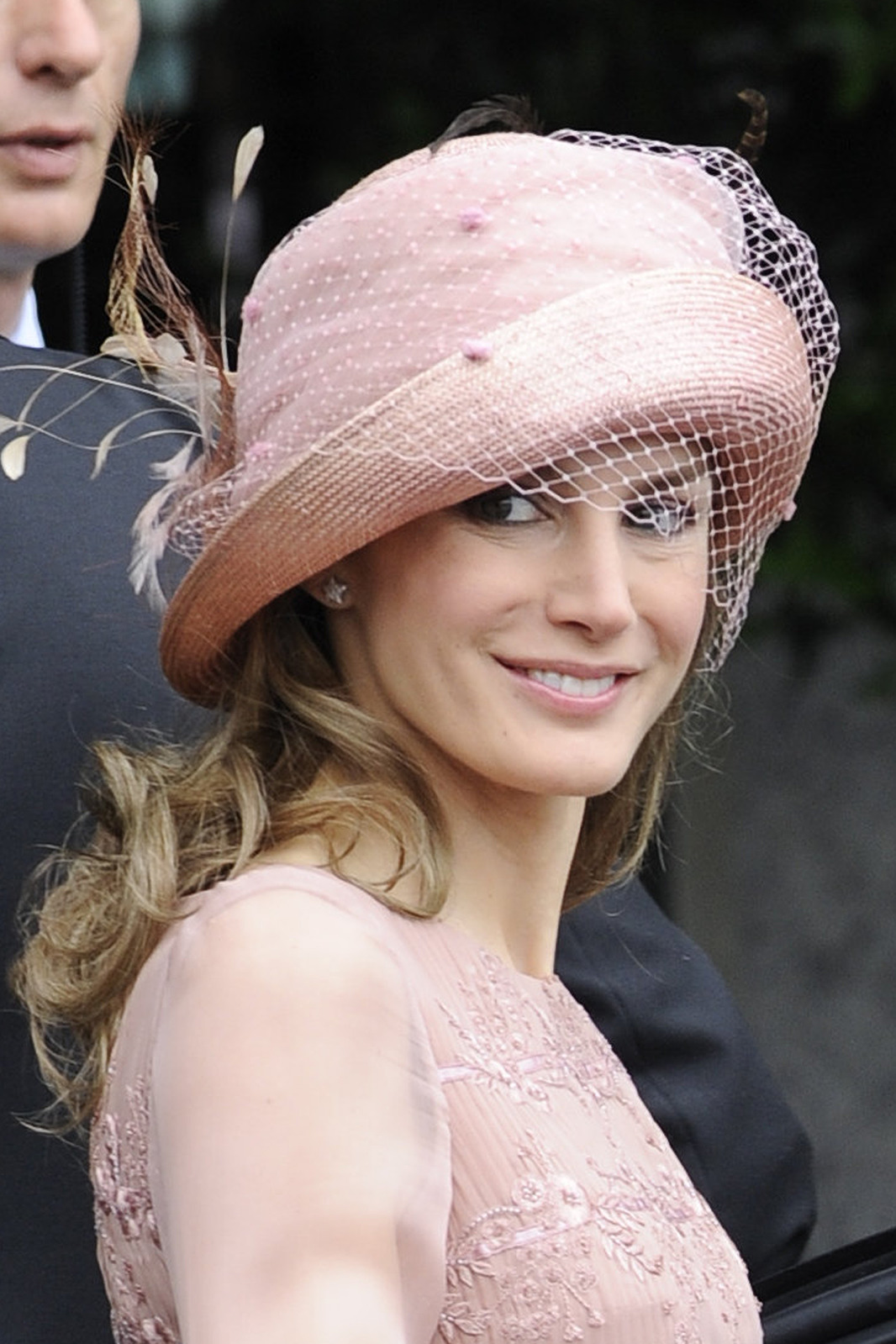 Para una de las grandes bodas de la realeza, el enlace del Príncipe Guillermo con Kate Middleton, doña Letizia escogió un vestido en muselina plisado rosa terracota con bordados imperio en hilo al tono de Felipe Varela. Completó su look con un sombrero de Pablo y Mayaya, muy favorecedor