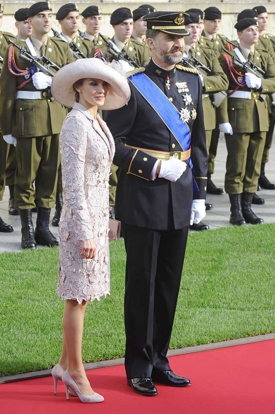 Los príncipes de Asturias en la boda entre el príncipe Guillermo de Luxemburgo y la belga Stéphanie de Lannoy. Letizia llevaba un abrigo de guipur de seda en tono maquillaje, un vestido de crepé de color topo. Optó por un sombrero bajo y ladeado del mismo tono que el abrigo y con el cubrió su melena recogida