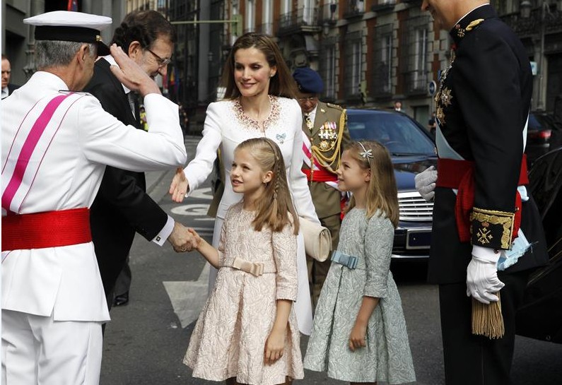 El presidente del Gobierno, Mariano Rajoy (2i), saluda a la Princesa de Asturias, junto a Doña Letizia, el Rey Felipe VI y la Infanta Sofía, a su llegada al Congreso de los Diputados para su proclamación de don Felipe VI como Rey de España por las Cortes Generales.