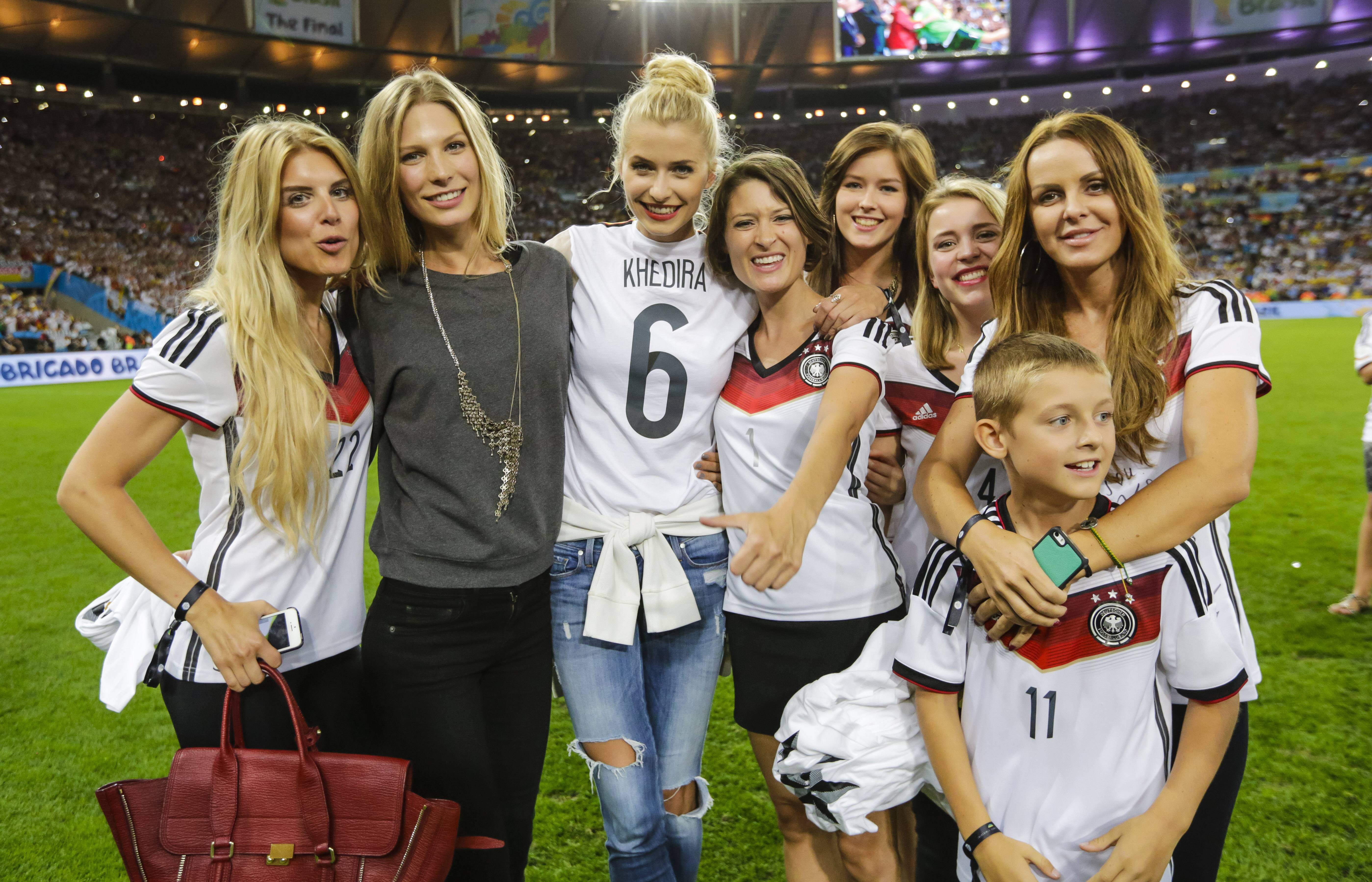 Algunas de las mujeres de los jugadores alemanaes posan sobre el césped.