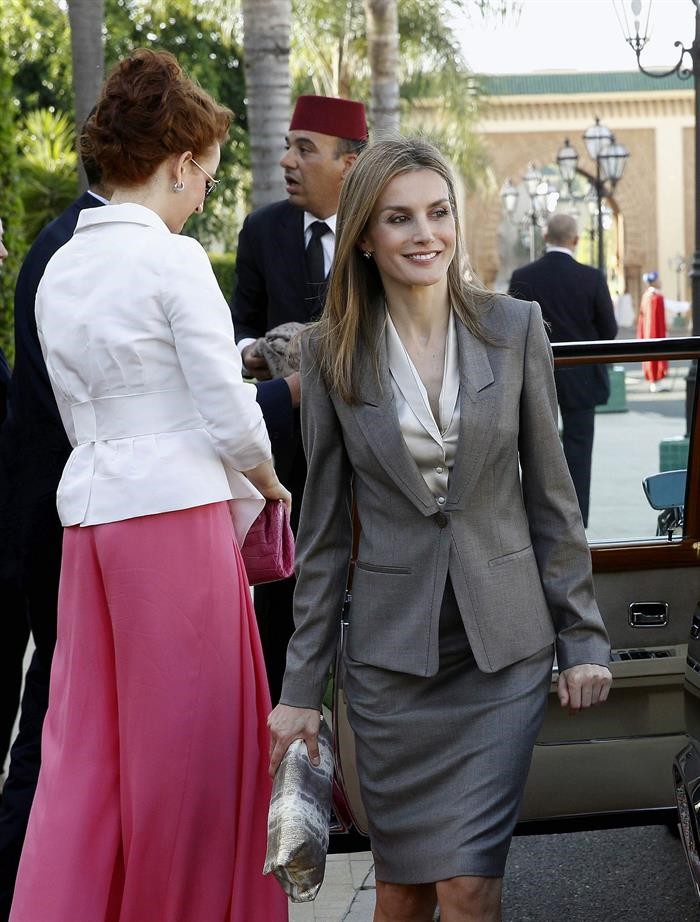 Doña Letizia llegó a Marruecos con un favorecedor traje gris de ejecutiva de Hugo Boss, que ya ha lucido en otras ocasiones. La princesa completó el look con unos salones en tonos topo y un clutch en tonos grises y blancos