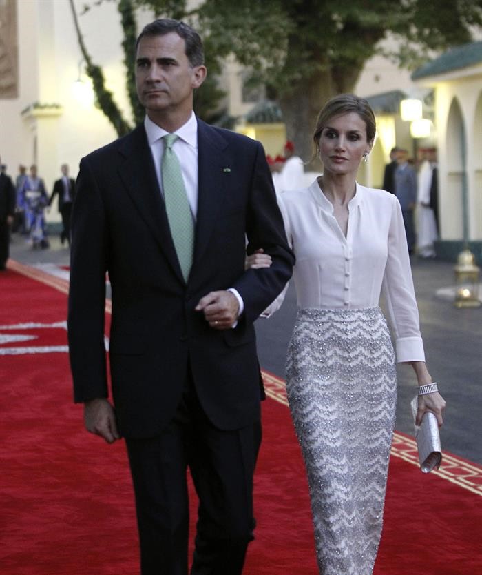 Este lunes por la noche los reyes asistieron invitados a una cena de gala. Para esta ocasión doña Letizia lució una falda larga con destellos plateados de Felipe Varela que combinó con camisa blanca y unas altísimas sandalias de raso plateado de Magrit a juego con un pequeño bolso de mano