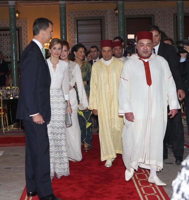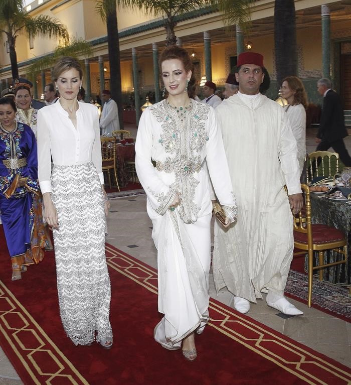 Lalla Salma optó por los mismos colores que doña Letizia, con un caftán en blanco con detalles plateados y de color esmeralda, que acompaño con un llamativo collar a juego con los pendientes