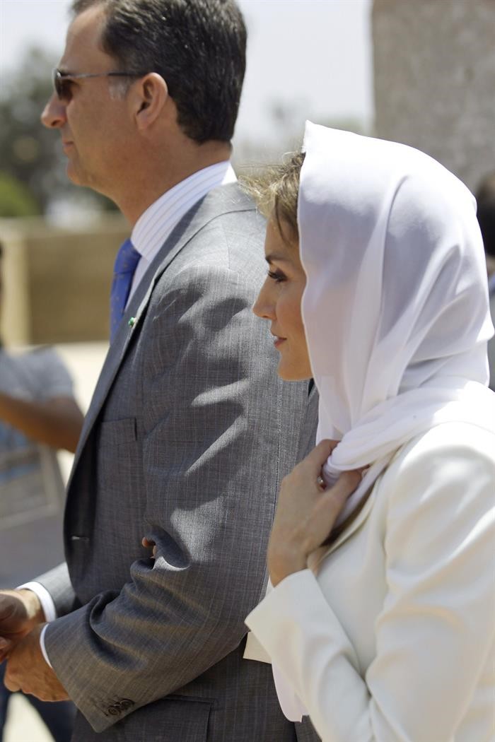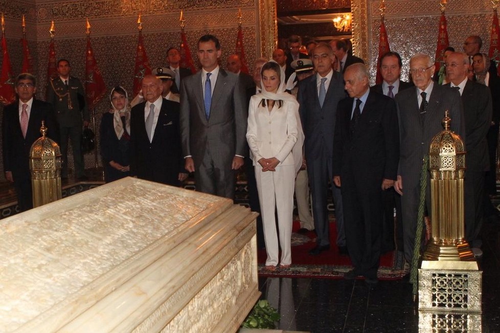 Los Reyes Felipe VI y Letizia, descalzos como mandan los cánones islámicos, durante la visita que han realizado este martes al Mausoleo de Mohamed V, en Rabat, en la segunda jornada de su viaje a Marruecos. EFE/Casa Real