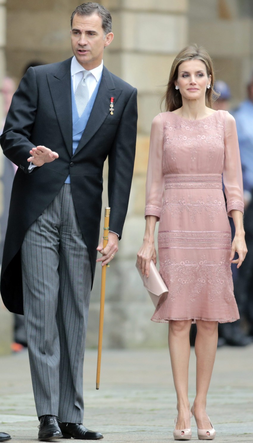Los Reyes de España han sido recibidos con aplausos a su llegada a Compostela para la tradicional ofrenda al Apóstol Santiago. Para una ocasión tan especial, Doña Letizia ha elegido un vestido que ya lució en la boda del príncipe Guillermo con Kate Middleton en abril de 2011.
