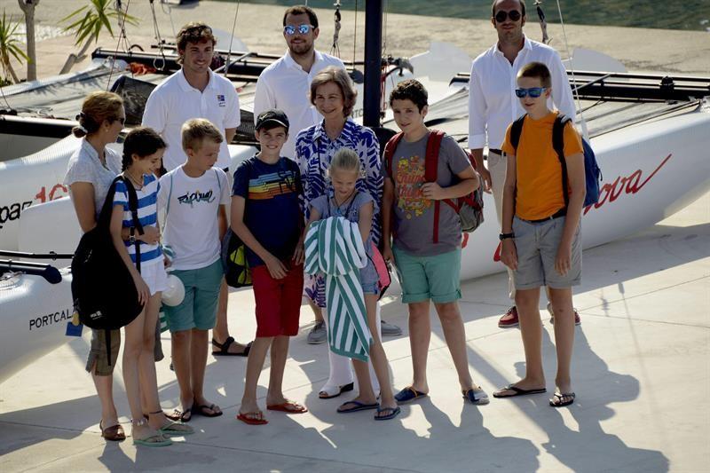 La reina Sofía, acompañada de la infanta Elena, sus hijos, Felipe Juan Froilán y Victoria Federica, y los cuatro de la infanta Cristina, Juan Valentín, Pablo Nicolás, Miguel e Irene, han posado para los medios de comunicación en la Escuela de Vela de Calanova.