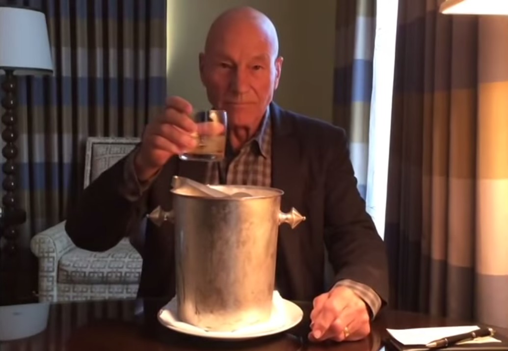 Otro de los famosos que ha dado una lección ha sido Patrick Stewart. Al actor, sin hablar, se le ve como firma un cheque y después coge un cubo con hielo para echarle a su copa de whisky.