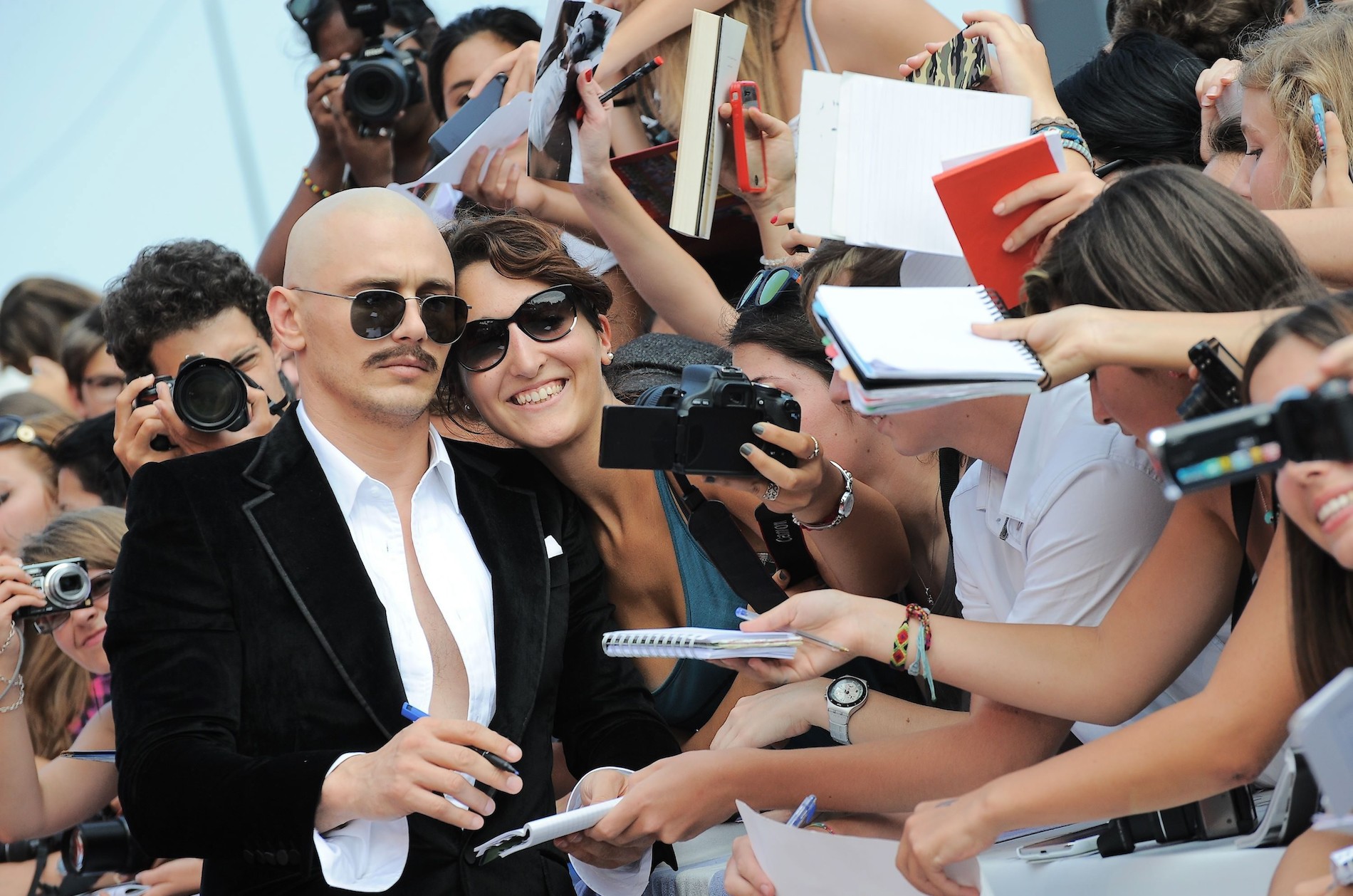 James Franco sorprendió con su nuevo look en el Festival de Venecia. Apareció rapado por exigencias de guión de la película Zeroville y con un tatuaje en la cabeza. Visiblemente más desmejorado, el actor posó con todos sus fans.